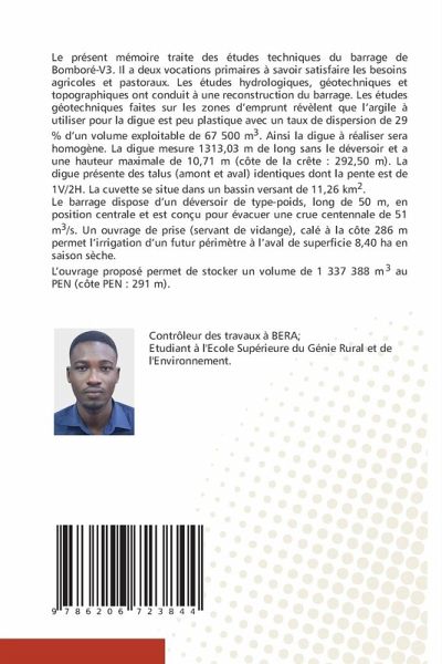 Le présent mémoire traite des études techniques du barrage de Bomboré-V3. Il a deux vocations primaires à savoir satisfaire les besoins agricoles et pastoraux. Les études hydrologiques, géotechniques et topographiques ont conduit à une reconstruction du barrage. Les études géotechniques faites sur les zones d'emprunt révèlent que l'argile à utiliser pour la digue est peu plastique avec un taux de dispersion de 29 % d'un volume exploitable de 67 500 m3. Ainsi la digue à réaliser sera homogène. La digue mesure 1313,03 m de long sans le déversoir et a une hauteur maximale de 10,71 m (côte de la crête : 292,50 m). La digue présente des talus (amont et aval) identiques dont la pente est de 1V/2H. La cuvette se situe dans un bassin versant de 11,26 km2.Le barrage dispose d'un déversoir de type-poids, long de 50 m, en position centrale et est conçu pour évacuer une crue centennale de 51 m3/s. Un ouvrage de prise (servant de vidange), calé à la côte 286 m permet l'irrigation d'un futur périmètre à l'aval de superficie 8,40 ha en saison sèche. L'ouvrage proposé permet de stocker un volume de 1 337 388 m3 au PEN (côte PEN : 291 m).
