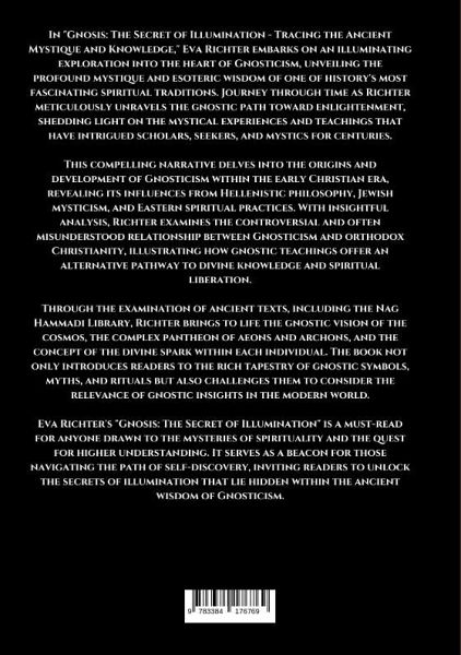 In "Gnosis: The Secret of Illumination - Tracing the Ancient Mystique and Knowledge," Eva Richter embarks on an illuminating exploration into the heart of Gnosticism, unveiling the profound mystique and esoteric wisdom of one of history's most fascinating spiritual traditions. Journey through time as Richter meticulously unravels the gnostic path toward enlightenment, shedding light on the mystical experiences and teachings that have intrigued scholars, seekers, and mystics for centuries.This compelling narrative delves into the origins and development of Gnosticism within the early Christian era, revealing its influences from Hellenistic philosophy, Jewish mysticism, and Eastern spiritual practices. With insightful analysis, Richter examines the controversial and often misunderstood relationship between Gnosticism and orthodox Christianity, illustrating how gnostic teachings offer an alternative pathway to divine knowledge and spiritual liberation.Through the examination of ancient texts, including the Nag Hammadi Library, Richter brings to life the gnostic vision of the cosmos, the complex pantheon of aeons and archons, and the concept of the divine spark within each individual. The book not only introduces readers to the rich tapestry of gnostic symbols, myths, and rituals but also challenges them to consider the relevance of gnostic insights in the modern world.Eva Richter's "Gnosis: The Secret of Illumination" is a must-read for anyone drawn to the mysteries of spirituality and the quest for higher understanding. It serves as a beacon for those navigating the path of self-discovery, inviting readers to unlock the secrets of illumination that lie hidden within the ancient wisdom of Gnosticism.