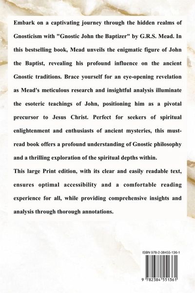 Embark on a captivating journey through the hidden realms of Gnosticism with "Gnostic John the Baptizer" by G.R.S. Mead. In this bestselling book, Mead unveils the enigmatic figure of John the Baptist, revealing his profound influence on the ancient Gnostic traditions. Brace yourself for an eye-opening revelation as Mead's meticulous research and insightful analysis illuminate the esoteric teachings of John, positioning him as a pivotal precursor to Jesus Christ. Perfect for seekers of spiritual enlightenment and enthusiasts of ancient mysteries, this must-read book offers a profound understanding of Gnostic philosophy and a thrilling exploration of the spiritual depths within. This large Print edition, with its clear and easily readable text, ensures optimal accessibility and a comfortable reading experience for all, while providing comprehensive insights and analysis through thorough annotations.