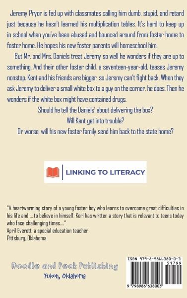 Sixth-grader Jeremy Pryor isn't about to stay in school. He's fed up with classmates calling him dumb, stupid, retard. With a new set of foster parents, Jeremy plans on being home schooled. Little does he know. Mr. and Mrs. Daniels aren't exactly ordinary parents. And their other foster child Kent, a seventeen-year-old who cracks his knuckles every three seconds, gives Jeremy a hard time. To say the least. Jeremy is ready to move on to another set of foster parents. Except for one thing. He likes the Daniels. They're interesting to Jeremy. His foster mother is a newspaper correspondent and his foster father sells tombstones. More important, both show their love for Jeremy. A victim of child abuse, Jeremy, however, wonders if the Daniels are up to something. And, if they are, what could it be? At first Kent and his friends-J.D. and Matt-tease Jeremy nonstop and, since they are bigger, Jeremy can't fight back. That's why when they ask Jeremy to do them a favor, he does. Then Kent and his friends treat Jeremy well. Now Jeremy wonders if the white box Kent and his friends asked him to deliver to a guy contained drugs. On top of that, Jeremy still hasn't learned his multiplication tables. How could he when his former foster mother kept locking him in a dark closet? The Daniels arrange for Kent to help Jeremy with math. The process teaches Jeremy that even though Kent appears tough on the outside he is not a bad guy deep inside. To Jeremy's surprise, he learns to really like Kent and doesn't want anything bad to happen to his foster brother. So Jeremy takes a courageous stand by confessing to Wilma and Ben about Kent and his friends. Wilma and Ben inform the police. After the police investigate, Jeremy knows Kent and his friends are involved with drugs. Jeremy suggests to Wilma and Ben that they take Kent to a talk-show that is giving a presentation section on gangs and drugs. The Daniels agree it's a great idea. Naturally, Kent doesn't want to go, but it's either that or a juvenile detention center. As a result of the show, Kent goes to boot camp, even though he doesn't want to. Meanwhile, Jeremy has sharp stomach pains. The doctor discovers Jeremy needs to have his appendix removed. Several days later and after surgery, Jeremy heads for home. Wilma and Ben tell him that they have a big surprise for him. For the life of him, Jeremy can't figure out what the surprise could be. Then, when Jeremy sees Kent at home, Jeremy realizes Kent changed. Thanks to the three-day boot camp. As for the Daniels, they're up to something all right. Jeremy discovers that something is what he always wanted, a real family. The Daniels adopt Kent and Jeremy.
