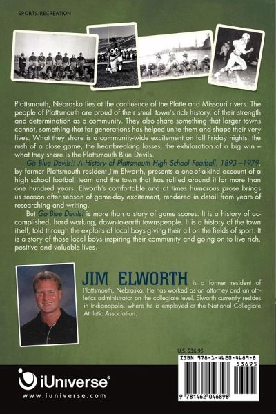 Plattsmouth, Nebraska lies at the confluence of the Platte and Missouri rivers. The people of Plattsmouth are proud of their small town's rich history, of their strength and determination as a community. They also share something that larger towns cannot, something that for generations has helped unite them and shape their very lives. What they share is a community-wide excitement on fall Friday nights, the rush of a close game, the heartbreaking losses, the exhilaration of a big win - what they share is the Plattsmouth Blue Devils. Go Blue Devils!: A History of Plattsmouth High School Football, 1893 -1979, by former Plattsmouth resident Jim Elworth, presents a one-of-a-kind account of a high school football team and the town that has rallied around it for more than one hundred years. Elworth's comfortable and at times humorous prose brings us season after season of game-day excitement, rendered in detail from years of researching and writing. But Go Blue Devils! is more than a story of game scores. It is a history of accomplished, hard working, down-to-earth townspeople. It is a history of the town itself, told through the exploits of local boys giving their all on the fields of sport. It is a story of those local boys inspiring their community and going on to live rich, positive and valuable lives.