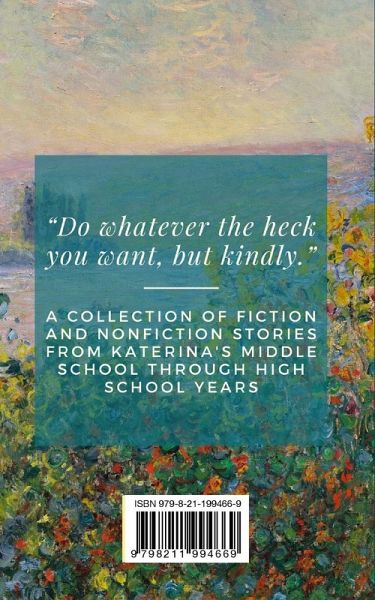 Essentially: this book is a collection of fiction and nonfiction stories from Katerina's middle school through high school years. This book has two sections: fiction and nonfiction, and each is ordered from oldest to newest writing. This means, hopefully, the pieces get better as you go! Whoo Hoo! Second, in the nonfiction section, all the stories are completely true and based on personal experience. The fictional section ranges from fever-dream-like stories to ones that were crystal clear in my head. In this section, you'll also find an excerpt of a piece I worked on for over three years in middle school. For nearly every story, you'll find a reflection or additional piece of writing from when I last edited it. Lastly, there is a small section at the end of the book with quotes from pieces that didn't make the cut but had some pretty interesting messages.