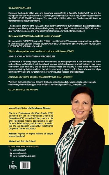 GO, CATERPILLAR...GO!! Embrace the beauty within you, and transform yourself into a Beautiful Butterfly! If you are the caterpillar, how can you be beautiful? Of course, you are beautiful! You are beautiful because you have the ESSENCE OF BEAUTY within you. You have all the abilities within you. You have what it takes to transform into a Beautiful Butterfly. This book will show you the REAL you. It will take you from your current state of dissatisfaction to a desired state of being whole, alive, and living every moment! It will create InnerMost Shifts within you, give you "aha" moments and bring about transformations for the better and the best! Do you want to EVOLVE to be the BEST version of yourself? Do you want to EMPOWER yourself to ENRICH your life further? You can develop your inner qualities to ultimately lead yourself to reach your HIGHER "SELF", become the BEST VERSION of yourself, and LIVE THE BEST VERSION of your life! Why do all the qualities mentioned in this book start with the word "Self"? SIMPLE. YOU CAN'T FIND THEM IN ANYONE ELSE! So this book is for every single person who wants to be more purposeful in life, love more, be more self-confident, self-resilient, self-disciplined, be more full of self-respect and self-esteem, have more self-control over emotions, and be able to control stress and anxiety. It is for those who want to overcome limiting beliefs and turn them into empowering ones. It is for those who want to align abilities with values and surge forward in life with elevated success and happiness! All in all, do you want to gain SELF-MASTERY through SELF-GROWTH? Well then, this book is for you! Reading this book, digesting and chewing its parts, and eventually swallowing them will bring you to be the BEST version of yourself. Go, Caterpillar...Go! GO OUT and RULE THE WORLD!! _________________________________________________________________________ ABOUT THE AUTHOR Veena Dhandhia is a Life Enrichment Director. She is a Professional Certified Coach (PCC) certified by the International Coaching Federation (ICF). Armed with this, she is a Life and Happiness Coach specializing in Self-Growth, Relationships, and Success. Added to this she is a Speaker, Mentor, NLP Practitioner, Corporate Trainer, and Author. Mission: Aspires to Inspire millions of people around the globe! Motto: Live Life to the Fullest!