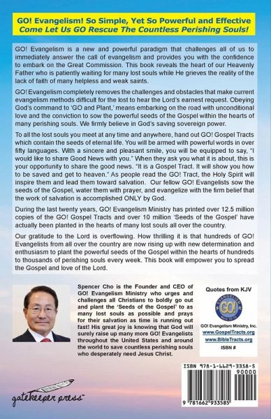 "The LORD thy God in the midst of thee is mighty; he will save, he will rejoice over thee with joy; he will rest in his love, he will joy over thee with singing" (Zephaniah 3:17 KJV). GO! Evangelism is a new paradigm that challenges all to immediately answer the evangelical call and provides the confidence to embark on the "Great Commission." This book shows the anxious heart of our Heavenly Father who laments humanity's lack of faith but also desires all believers to proselytize and plant the seeds of the gospel. "GO!" is a simple yet powerful command with profound implications. For too many souls, the gate of Hell is blocked only by the obedient, sacrificial, and God-glorifying work of evangelists. Therefore, "GO!" removes all the stumbling blocks of traditional proselytizing methods, and harkens to the Lord's request so all believers can immediately testify the gospel. Many "GO!" Evangelists experience the power of the Holy Spirit directly and embrace their transformation into amazing people of God. Spencer wants to share the abundant blessings of a prosperous Christian life with all the believers living in America. GO! Evangelism has been obedient to the Lord, entirely relying on the power of the Holy Spirit. These powerful Seeds of the Gospel are available at GO! Ministry sites: www.GospelTracts.org www.BibleTracts.org Obeying God's command to "GO! and Plant" means embarking on the road with the conviction to sow the powerful "seeds of the gospel" within hearts as we firmly believe in God's almighty sovereignty and power of salvation. Now, Spirit-filled "GO!" Evangelists full of holy zeal, joy, and enthusiasm are springing up like wildfire all over the United States. God is now saving countless lost souls through their faithful dedication and fervent love for the Lord.