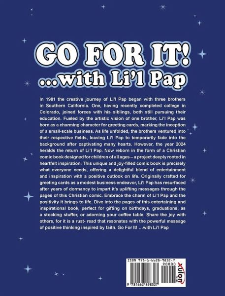 In 1981 the creative journey of Li'l Pap began with three brothers in Southern California. One, having recently completed college in Colorado, joined forces with his siblings, both still pursuing their education. Fueled by the artistic vision of one brother, Li'l Pap was born as a charming character for greeting cards, marking the inception of a small-scale business. As life unfolded, the brothers ventured into their respective fields, leaving Li'l Pap to temporarily fade into the background after captivating many hearts. However, the year 2024 heralds the return of Li'l Pap. Now reborn in the form of a Christian comic book designed for children of all ages - a project deeply rooted in heartfelt inspiration. This unique and joy-filled comic book is precisely what everyone needs, offering a delightful blend of entertainment and inspiration with a positive outlook on life. Originally crafted for greeting cards as a modest business endeavor, Li'l Pap has resurfaced after years of dormancy to impart it's uplifting messages through the pages of this Christian comic. Embrace the charm of Li'l Pap and the positivity it brings to life. Dive into the pages of this entertaining and inspirational book, perfect for gifting on birthdays, graduations, as a stocking stuffer, or adorning your coffee table. Share the joy with others, for it is a rust- read that resonates with the powerful message of positive thinking inspired by faith. Go For It! ...with Li'l Pap