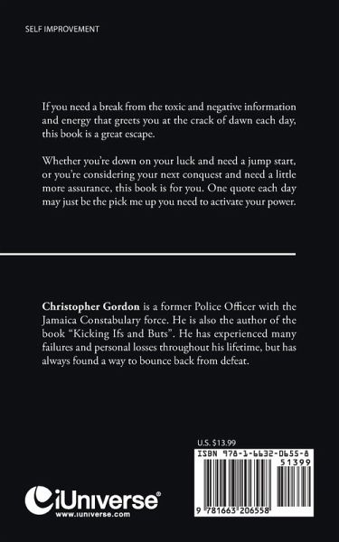 If you need a break from the toxic and negative information and energy that greets you at the crack of down each day, this book is a great escape. Whether you're down on your luck and need a jump start, or you're considering your next conquest and need a little more assurance, this book is for you. One quote each day may just be the pick me up you need to activate your power.