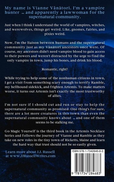 My name is Vianne Vân¿tori. I'm a vampire hunter... and apparently a lawwoman for the supernatural community. Just when I think I understand this world of vampires, witches, and werewolves, things get weird. Like, gnomes, fairies, and pixies weird. Now, I'm the liaison between humans and the supernatural community just as my Vân¿tori ancestors once were. Of course, my ancestors didn't need vampire blood to gain access to their powers and weren't distracted by the urge to find the only vampire in town, jump his bones, and drink his blood. Romantic, right? While trying to help some of the nonhuman citizens in town, I get a visit from something scary enough to terrify Ramble, my hellhound sidekick, and frighten Artemis. To make matters worse, it turns out Artemis isn't exactly the most trustworthy of allies. I'm not sure if I should cut and run or stay to help the supernatural community as promised. One thing's for sure, there are a lot more creatures in this town than even the supernatural community knows about... and one of them seems to be stalking me. Go Magic Yourself is the third book in the Artemis Necklace Series and follows the journey of Vianne and Ramble as they take on new roles in the tiny town of Ricketts, Maine and learn the hard way that trust should not be so easily given. **Stay tuned for Book 4 at end of 2021**