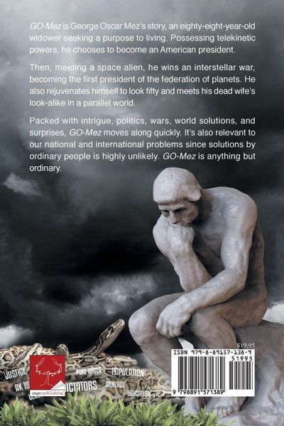 GO-Mez! is George Oscar Mez's story, an eighty-eight-year-old widower seeking a purpose to living. Possessing telekinetic powers, he chooses to become an American president. Then, meeting a space alien, he wins an interstellar war, becoming the first president of the federation of planets. He also rejuvenates himself to look fifty and meets his dead wife's look-alike in a parallel world. Packed with intrigue, politics, wars, world solutions, and surprises, GO-Mez! moves along quickly. It's also relevant to our national and international problems since solutions by ordinary people is highly unlikely. GO-Mez! is anything but ordinary.