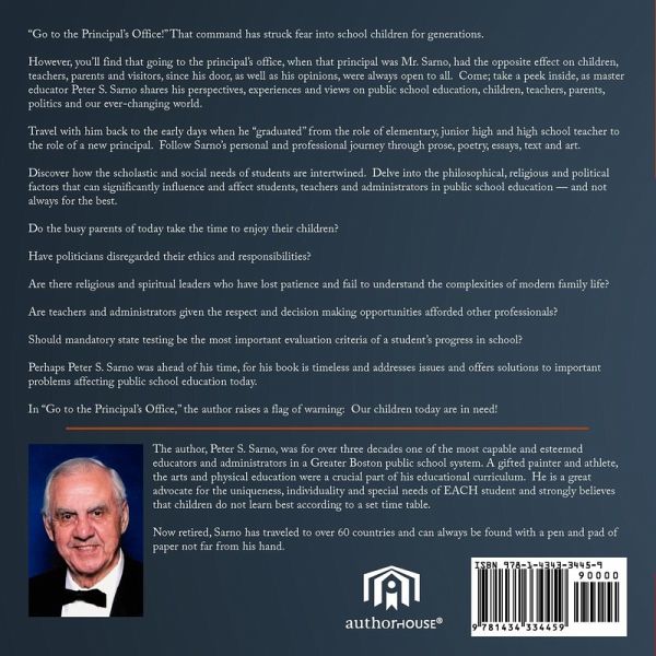 "Go to the Principal's Office!" That command has struck fear into school children for generations. However, you'll find that going to the principal's office, when that principal was Mr. Sarno, had the opposite effect on children, teachers, parents and visitors, since his door, as well as his opinions, were always open to all. Come; take a peek inside, as master educator Peter S. Sarno shares his perspectives, experiences and views on public school education, children, teachers, parents, politics and our ever-changing world. Travel with him back to the early days when he "graduated" from the role of elementary, junior high and high school teacher to the role of a new principal. Follow Sarno's personal and professional journey through prose, poetry, essays, text and art. Discover how the scholastic and social needs of students are intertwined. Delve into the philosophical, religious and political factors that can significantly influence and affect students, teachers and administrators in public school education - and not always for the best. Do the busy parents of today take the time to enjoy their children? Have politicians disregarded their ethics and responsibilities? Are there religious and spiritual leaders who have lost patience and fail to understand the complexities of modern family life? Are teachers and administrators given the respect and decision making opportunities afforded other professionals? Should mandatory state testing be the most important evaluation criteria of a student's progress in school? Perhaps Peter S. Sarno was ahead of his time, for his book is timeless and addresses issues and offers solutions to important problems affecting public school education today. In "Go to the Principal's Office," the author raises a flag of warning: Our children today are in need!