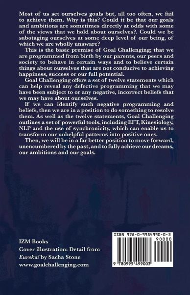 Most of us set ourselves goals but, all too often, we fail to achieve them. Why is this? Could it be that our goals and ambitions are sometimes directly at odds with some of the views that we hold about ourselves?. Could we be sabotaging ourselves at some deep level of our being, of which we are wholly unaware? This is the basic premise of Goal Challenging; that we are programmed from birth by our parents, our peers and society to behave in certain ways and to believe certain things about ourselves that are not conducive to achieving happiness, success or our full potential. Goal Challenging öers a set of twelve statements which can help reveal any defective programming that we may have been subject to or any negative, incorrect beliefs that we may have about ourselves. If we can identify such negative programming and beliefs, then we are in a position to do something to resolve them. As well as the twelve statements, Goal Challenging outlines a set of powerful tools, including EFT, Kinesiology, NLP and the use of synchronicity, which can enable us to transform our unhelpful patterns into positive ones. Then, we will be in a far better position to move forward, unencumbered by the past, and to fully achieve our dreams, our ambitions and our goals.