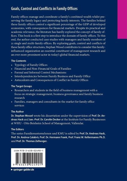 Family offices manage and coordinate a family's combined wealth whilst preserving the family legacy and protecting family interests. The families behind these family offices control a significant percentage of the GDP of developed economies, with consequences for financial markets. At the same time, family offices act at the intersection of family and commerce, which makes this particular form of organization appealing to the field of strategic management. Despite its practical and academic relevance, the literature has hardly explored the concept of family offices. As a result, the primary objective of this book is to introduce the domain of family offices. By exploring goals, control and conflicts in the context of family offices, this book contributes to consider this family-influenced organization an essential constituent of management research and an ever more prominent actor in today's global financial markets.