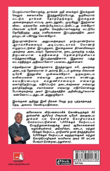 Goals is a self-help book by bestselling author Brian Tracy, which provides deep insights and advice on how goals are to be set and how to meet them. Originally penned in English, this book is its Tamil translation. Opening with a Chicago setting, the story in the book revolves around rich entrepreneurs who discuss their journey up the ladder of success. The wisest in this group then concludes that it is only when you set practical goals for yourself that you can taste real success in life. Beginning with this light story, the book then proceeds on to explain the seven important elements of setting goals. Further, it outlines 12 key steps that help accomplish goals, no matter what their size is. There is also the 'Mental Fitness' character-development program described at length in the book, which teaches people how to become strong from within so that they can achieve whatever goals they have set in life for themselves. In addition, with apt examples from real life the author describes how one can build their self-confidence and esteem that are required for achieving success in life. A few other vital aspects explained in the book include how to cross over difficulties, how to meet challenges head on and how to forge ahead in life no matter what happens. Written in a simple language, Goals was published by Manjul as first edition in the year 2014. It is available in paperback.