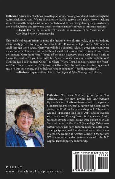 Goat Farm Road, Poems from the Adirondacks presents a glimpse into life being lived in a little-populated area of Upstate New York, off-grid, in woodland and wildlife surroundings. The collection is an invitation to share the healing silence and visual delights of seasons and nature unfolding. Some lyrical selections touch on aging, brush with cancer and mortality. Others are lighter, more playful. A few haiku and tanka deliver quick snapshots of the author's observations, while longer poems provide inner meditations and reflections.
