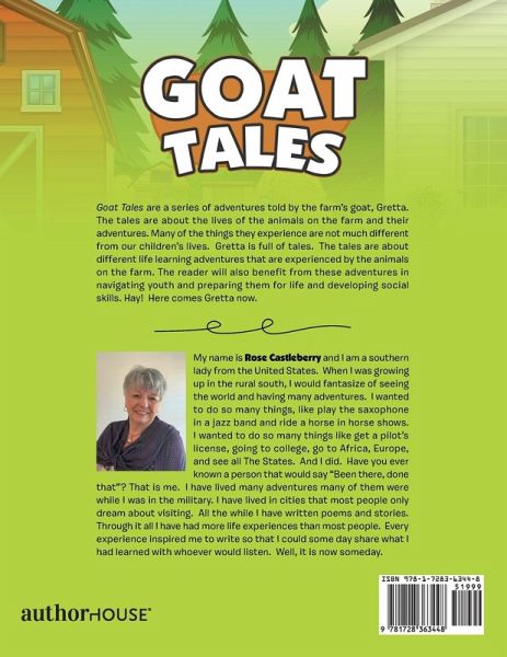 Goat Tales are a series of adventures told by the farm's goat, Gretta. The tales are about the lives of the animals on the farm and their adventures. Many of the things they experience are not much different from our children's lives. Gretta is full of tales. The tales are about different life learning adventures that are experienced by the animals on the farm. The reader will also benefit from these adventures in navigating youth and preparing them for life and developing social skills. Hay! Here comes Gretta now.