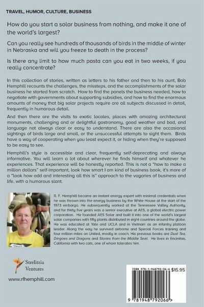 How do you start a solar business from nothing, and make it one of the world's largest? Can you really see hundreds of thousands of birds in the middle of winter in Nebraska and will you freeze to death in the process? Is there any limit to how much pasta can you eat in two weeks, if you really concentrate? In this collection of stories, written as letters to his father and then to his aunt, Bob Hemphill recounts the challenges, the missteps, and the accomplishments of the solar business he started from scratch. How to find the panels the business needed, how to negotiate with governments about supporting subsidies, and how to find the enormous amounts of money that big solar projects require are all subjects discussed in detail, frequently in humorous detail. And then there are the visits to exotic locales, places with amazing architectural monuments, challenging and or delightful gastronomy, good weather and bad, and language not always clear or easy to understand. There are also the occasional sightings of birds large and small, or the unsuccessful attempts to sight them. Birds have a way of cooperating when you least expect it, or hiding when they're supposed to be easy to see. Hemphill's style is accessible and clear, frequently self-deprecating and always informative. You will learn a lot about wherever he finds himself and whatever he experiences. That experience will be honestly reported. This is not a "how to make a million dollars" self-important, look how smart I am kind of business book, it's more of a "look how odd and interesting all this is" approach to the vagaries of business and life, with a humorous slant.