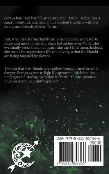 Soraya has lived her life as a pampered Haraki Hexen. She's smart, beautiful, talented, and is content traveling with her family and friends all over Turin. But, when she learns that those in her caravan are ready to retire and move to the city, she's left on her own. When she eventually seeks them out again, she can't find them. Instead, she meets the mysterious Kir who divulges that the Haraki are being targeted by slavers. Certain that her friends have either been captured or are in danger, Soraya agrees to help Kir uncover and defeat the underground slaving operation in Turin. They're about to uncover more than they expected...