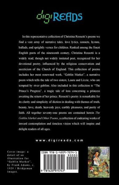 In this representative collection of Christina Rossetti's poems we find a vast array of narrative tales, love lyrics, sonnets, hymns, ballads, and sprightly verses for children. Ranked among the finest English poets of the nineteenth century, Christina Rossetti is a widely read, though not widely imitated poet, recognized for her devotional poetry, influenced by the religious conservatism and asceticism of the Church of England. This collection of poems includes her most renowned work, "Goblin Market", a narrative poem which tells the tale of two sisters, Laura and Lizzie, who are tempted by river goblins. Also included in this collection is "The Prince's Progress", a tragic tale of loss concerning a princess awaiting the return of her prince. Rossetti's poetry is remarkable for its clarity and simplicity of diction in dealing with themes of truth, beauty, love, death, heavenly joys, earthly pleasures, and purity of faith. All together seventy-one poems are contained herein "Goblin Market and Other Poems", a collection of endearing works of inward contemplation and timeless vision which will inspire and delight readers of all ages. This edition is printed on premium acid-free paper.