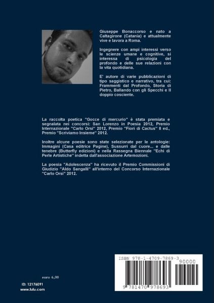 Raccolta di poesie scritte durante i mesi Ottobre-Novembre 2011. La raccolta poetica "Gocce di mercurio" è stata premiata e segnalata nei concorsi: San Lorenzo in Poesia 2012, Premio Internazionale "Carlo Orsi" 2012, Premio "Fiori di Cactus" II ed., Premio "Scriviamo Insieme" 2012. Inoltre alcune poesie sono state selezionate per le antologie: Immagini (Casa editrice Pagine), Sussurri dal cuore... e dalle tenebre (Butterfly edizioni) e nella Rassegna Biennale "Echi di Perle Artistiche" indetta dall'associazione Artemozioni. La poesia "Adolescenza" ha ricevuto il Premio Commissioni di Giudizio "Aldo Sangalli" all'interno del Concorso Internazionale "Carlo Orsi" 2012.