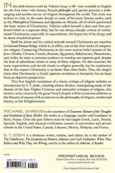 In this little-known work by Voltaire (1694-1778)-now available in English for the first time- the famous French philosophe and satirist presents a wide-ranging and acerbic survey of religion throughout the world. Written toward the end of his life in 1769, the work was penned in the same decade as some of his more famous works-the Philosophical Dictionary, Questions on Miracles, and Lord Bolingbroke's Important Examination-all of which questioned the basic tenets of Christianity.Voltaire called himself a deist and thus he professed belief in a supreme deity. But he was always sharply critical of institutional Christianity, especially its superstitions, the hypocrisy of its clergy, and its abuse of political power. Both his deism and his critical attitude toward Christianity are manifest in God and Human Beings, which is, in effect, one of the first works of comparative religion. Comparing Christianity to the more ancient belief systems of the Jews, Hindus, Chinese, Greeks, Romans, Egyptians, Babylonians, Phoenicians, and Arabs, he notes a common tendency to worship one supreme god, despite the host of subordinate deities in many of these religions. He also critiques the many superstitions and slavish rituals in religion generally, but he emphasizes that in this respect Christianity is no better than other faiths. Thus, the clergy's claim that Christianity is God's supreme revelation to humanity has no basis from an objective perspective. This first English translation of a classic critique of religion includes an introduction by writer, scholar, and editor S. T. Joshi, who wrote the article on Voltaire in The New Encyclopedia of Unbelief (edited by Tom Flynn). Anticipating many of the themes of the later Higher Criticism and rationalist critiques of religion, this incisive, witty treatise by the great French skeptic will be a welcome addition to the libraries of anyone with an interest in the philosophy of religion, intellectual history, or the Enlightenment.