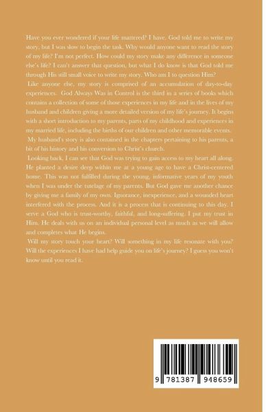 Have you ever wondered if your life mattered? I have. Why would anyone want to read the story of my life? I'm not perfect. How can the story of my life make any difference in someone else's life? I can't answer that question for you as an individual because I don't know what you have gone through. I don't know the words to say that would open up your heart. What I do know is this; God told me through His still small voice to write my story and who am I to question Him? Like anyone else, my story is comprised of an accumulation of day-to-day experiences. God Always Was in Control is the third in a series of books which contains a collection of some of those experiences in my life and in the lives of my husband and children giving a more detailed version of my life's journey. It begins with a short introduction to my parents, parts of my childhood and experiences in my married life, including the births of our children and other memorable events. My husband's story is also contained in the chapters pertaining to his parents, a bit of his history and his conversion to Christ's church. Looking back, I can see that God was trying to gain access to my heart all along. He planted a desire deep within me at a young age to have a Christ-centered home. This was not fulfilled during the young, informative years of my youth when I was under the tutelage of my parents. But God gave me another chance by giving me a family of my own. Ignorance, inexperience, and a wounded heart interfered with the process. And it is a process that is continuing to this day. I serve a God who is trust-worthy, faithful, and long-suffering. I put my trust in Him. He deals with us on an individual personal level as much as we will allow and He completes what He begins. Will my story touch your heart? Will something in my life resonate with you? Will the experiences I have had help guide you on life's journey? I guess you won't know until you read it.