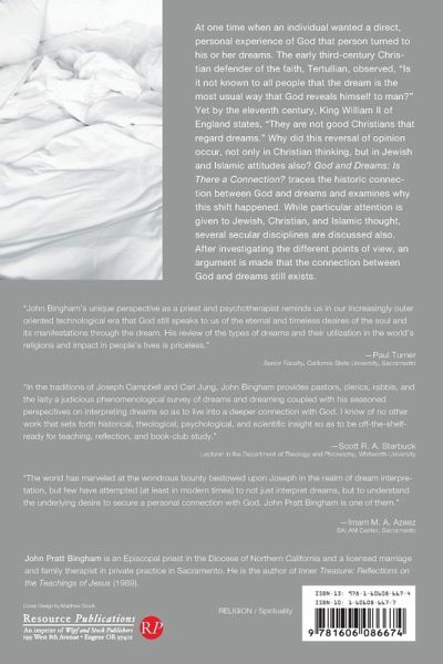 At one time when an individual wanted a direct, personal experience of God that person turned to his or her dreams. The early third century Christian defender of the faith, Tertullian, observed, "Is it not known to all people that the dream is the most usual way that God reveals himself to man?" Yet by the eleventh century, King William II of England states, "They are not good Christians that regard dreams." Why did this reversal of opinion occur, not only in Christian thinking, but in Jewish and Islamic attitudes also? God and Dreams: Is There a Connection? traces the historic connection between God and dreams and examines why this shift happened. While particular attention is given to Jewish, Christian, and Islamic thought, several secular disciplines are discussed also. After investigating the different points of view, an argument is made that the connection between God and dreams still exists.