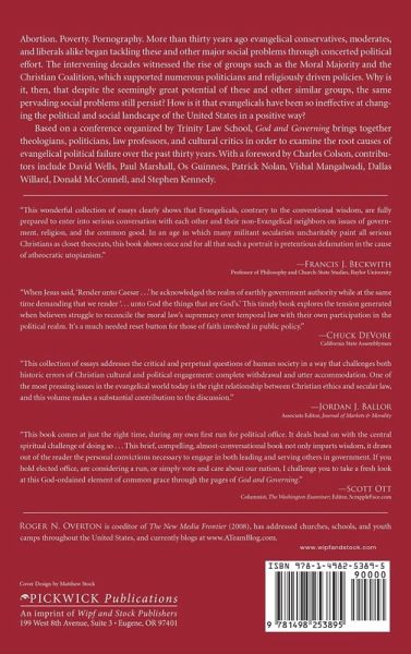 Abortion. Poverty. Pornography. More than thirty years ago evangelical conservatives, moderates, and liberals alike began tackling these and other major social problems head on through concerted political effort. The intervening decades witnessed the rise of groups such as the Moral Majority and the Christian Coalition, which supported numerous politicians and religiously driven policies. Why is it, then, that despite the seemingly great potential of these and other similar groups, the same pervading social problems still persist? How is it that evangelicals have been so ineffective at changing the political and social landscape of the United States in a positive way? Based on a conference organized by Trinity Law School, God and Governing brings together theologians, politicians, law professors, and cultural critics in order to examine the root causes of evangelical political failure over the past thirty years. With a foreword by Charles Colson, contributors include David Wells, Paul Marshall, Os Guinness, Patrick Nolan, Vishal Mangalwadi, Dallas Willard, Donald McConnell, and Stephen Kennedy.