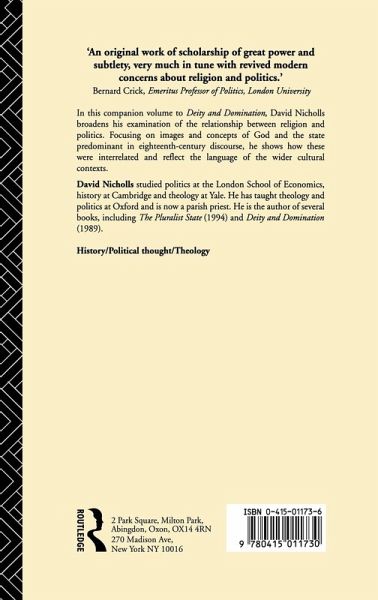 In this companion volume to Deity and Domination, David Nicholls broadens his examination of the relationship between religion and politics. Focusing on the images and concepts of God and the state predominant in eighteenth-century discourse, he shows how these were interrelated and reflect the language of the wider cultural contexts. Nicholls argues that the way a community pictures God will inevitably reflect (and also affect) its general understanding of authority, whether it be in state, in family or in other social institutions. Much language about God, for example, has a primarily political reference: in psalms, hymns and sermons God is called king, judge, lord, ruler and to him are ascribed might, majesty, dominion, power and sovereignty. But if political rhetoric is frequently incorporated into religious discourse, the reverse is also true: many key concepts of modern political theory are secularised theological concepts. In his consideration of this important and neglected relationship Nicholls sheds new light on religion and politics in the eighteenth century.
