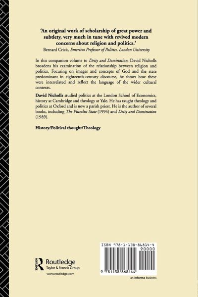 In this companion volume to Deity and Domination, David Nicholls broadens his examination of the relationship between religion and politics. Focusing on the images and concepts of God and the state predominant in eighteenth-century discourse, he shows how these were interrelated and reflect the language of the wider cultural contexts. Nicholls argues that the way a community pictures God will inevitably reflect (and also affect) its general understanding of authority, whether it be in state, in family or in other social institutions. Much language about God, for example, has a primarily political reference: in psalms, hymns and sermons God is called king, judge, lord, ruler and to him are ascribed might, majesty, dominion, power and sovereignty. But if political rhetoric is frequently incorporated into religious discourse, the reverse is also true: many key concepts of modern political theory are secularised theological concepts. In his consideration of this important and neglected relationship Nicholls sheds new light on religion and politics in the eighteenth century.