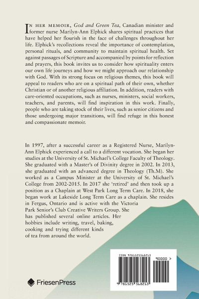 In her memoir, God and Green Tea, Canadian minister and former nurse Marilyn-Ann Elphick shares spiritual practices that have helped her flourish in the face of challenges throughout her life. Elphick's recollections reveal the importance of contemplation, personal rituals, and community to maintain spiritual health. Set against passages of Scripture and accompanied by points for reflection and prayers, this book invites us to consider how spirituality enters our own life journeys and how we might approach our relationship with God. With its strong focus on religious themes, this book will appeal to readers who are on a spiritual path of their own, whether Christian or of another religious affiliation. In addition, readers with care-oriented occupations, such as nurses, ministers, social workers, teachers, and parents, will find inspiration in this work. Finally, people who are taking stock of their lives, such as senior citizens and those undergoing major transitions, will find refuge in this honest and compassionate memoir.