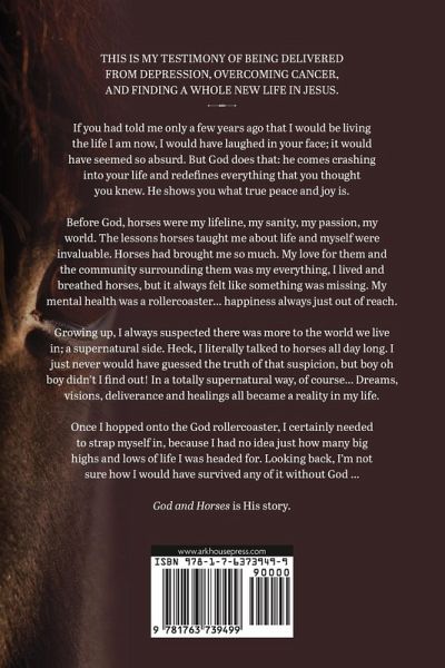THIS IS MY testimony of being delivered from depression, overcoming cancer, and finding a whole new life IN JESUS. If you had told me only a few years ago that I would be living the life I am now, I would have laughed in your face; it would have seemed so absurd. But God does that: he comes crashing into your life and redefines everything that you thought you knew. He shows you what true peace and joy is. Before God, horses were my lifeline, my sanity, my passion, my world. The lessons horses taught me about life and myself were invaluable. Horses had brought me so much. My love for them and the community surrounding them was my everything, I lived and breathed horses, but it always felt like something was missing. My mental health was a rollercoaster... happiness always just out of reach. Growing up, I always suspected there was more to the world we live in; a supernatural side. Heck, I literally talked to horses all day long. I just never would have guessed the truth of that suspicion, but boy oh boy didn't I find out! In a totally supernatural way, of course... Dreams, visions, deliverance and healings all became a reality in my life. Once I hopped onto the God rollercoaster, I certainly needed to strap myself in, because I had no idea just how many big highs and lows of life I was headed for. Looking back, I'm not sure how I would have survived any of it without God ... God and Horses is His story.