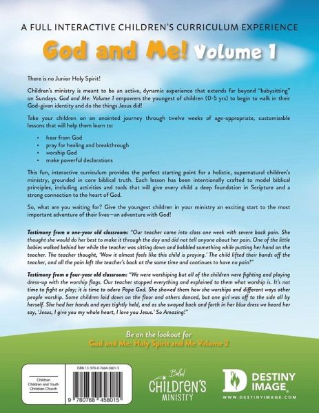 A Full Interactive Children's Curriculum Experience God and Me! Volume 1 There is no Junior Holy Spirit! Children's ministry is meant to be an active, dynamic experience that extends far beyond "babysitting" on Sundays. God and Me: Volume 1 empowers the youngest of children (0-5 yrs) to begin to walk in their God-given identity and do the things Jesus did! Take your children on an anointed journey through twelve weeks of age-appropriate, customizable lessons that will help them learn to:hear from God pray for healing and breakthrough worship God make powerful declarations This fun, interactive curriculum provides the perfect starting point for a holistic, supernatural children's ministry, grounded in core biblical truth. Each lesson has been intentionally crafted to model biblical principles, including activities and tools that will give every child a deep foundation in Scripture and a strong connection to the heart of God. So, what are you waiting for? Give the youngest children in your ministry an exciting start to the most important adventure of their lives-an adventure with God!