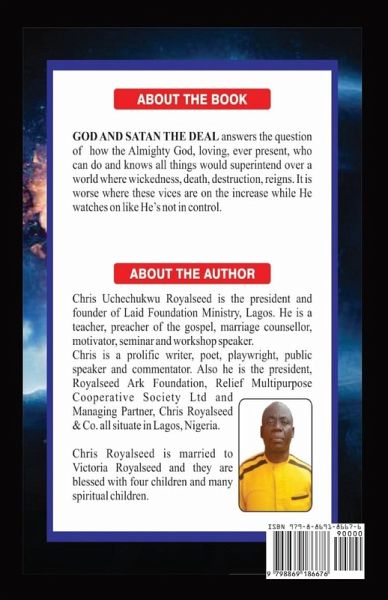 GOD AND SATAN THE DEAL answers the question of how the Almighty God, loving, ever present, who can do and knows all things would superintend over a world where wickedness, death, destruction, reigns. It is worse where these vices are on the increase while He watches on like He's not in control.. It had been a thing of concern to many that a world created by a loving God can be in such state chaos as it is today. This raised so many question. Is there a God over the universe as ruler to whom other powers are subject. Does he have a hand in the evil that ravage the world today. Of course we know that by His nature as taught by those who are knowledgeable in theology, He is a good God, loving, caring, and in control. If we agree what is said of Him, then something must be wrong with the world. Evil cannot rain where righteousness rules. This book points to the missing link that puts Satan in the saddle of the events on earth as if God was helpless against the devil. This book tells what happened before the advent of man which raised question that many could not answer. "Where is God while the devil reigned. As explained, God only allowed the devil opportunity to exhust his wisdom in the fight against God. He should know that the best of his arsenal is no match for the wisdom of God. The devil already played into the hands of God. His doom is confirmed. There is nothing he can do about it. What you see today is mere roaring of a man that has been defeated.. But Satan sure knows he could still capture the ignorant, fearful and unbelieving. The choice is for anyone who cares about a future in eternity.
