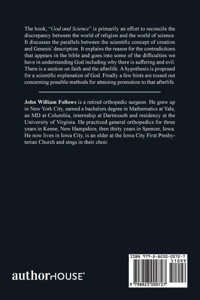 The book, "God and Science" is primarily an effort to reconcile the discrepancy between the world of religion and the world of science. It discusses the parallels between the scientific concept of creation and Genesis' description. It explains the reason for the contradictions that appears in the bible and goes into some of the difficulties we have in understanding God including why there is suffering and evil. There is a section on faith and the afterlife. A hypothesis is proposed for a scientific explanation of God. Finally a few hints are tossed out concerning possible methods for attaining promotion to that afterlife.