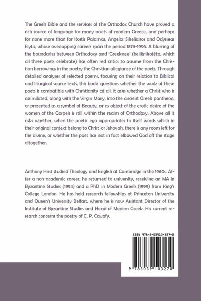 The Greek Bible and the services of the Orthodox Church have proved a rich source of language for many poets of modern Greece, and perhaps for none more than for Kostis Palamas, Angelos Sikelianos and Odysseas Elytis, whose overlapping careers span the period 1876-1996. A blurring of the boundaries between Orthodoxy and 'Greekness' (hellênikotêta, which all three poets celebrate) has often led critics to assume from the Christian borrowings in the poetry the Christian allegiance of the poets.