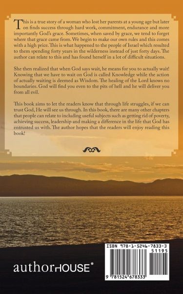 This is a true story of a woman who lost her parents at a young age but later on finds success through hard work, commitment, endurance and more importantly God's grace. Sometimes, when saved by grace, we tend to forget where that grace came from. We begin to make our own rules and this comes with a high price. This is what happened to the people of Israel which resulted to them spending forty years in the wilderness instead of just forty days. The author can relate to this and has found herself in a lot of difficult situations. She then realized that when God says wait, he means for you to actually wait! Knowing that we have to wait on God is called Knowledge while the action of actually waiting is deemed as Wisdom. The healing of the Lord knows no boundaries. God will find you even to the pits of hell and he will deliver you from all evil. This book aims to let the readers know that through life struggles, if we can trust God, He will see us through. In this book, there are many other chapters that people can relate to including useful subjects such as getting rid of poverty, achieving success, leadership and making a difference in the life that God has entrusted us with. The author hopes that the readers will enjoy reading this book!