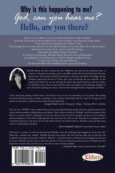 Why is this happening to me? God, can you hear me? Hello, are you there? Have you ever called out to God and felt abandoned, empty, forsaken? Jesus did. On the day of his crucifixion Jesus cried out those very sentiments. "God, why have you forsaken me?" (Matt 27:46). Even though there are times when we cry out and feel lonely we are never alone. He is with us always. In God, are you listening?, Michelle Bryant shares her desperation searching for and crying out to a God she thought could not hear her. It is the story of a life of abuse, fear and insecurity that is now filled with unbridled passion, peace and freedom. Go to: for more details.