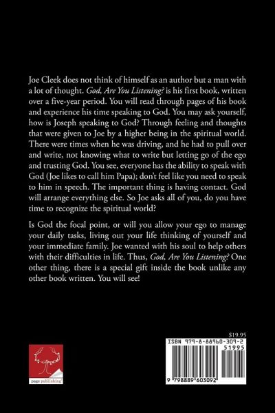 Joe Cleek does not think of himself as an author but a man with a lot of thought. God, Are You Listening? is his first book, written over a five-year period. You will read through pages of his book and experience his time speaking to God. You may ask yourself, how is Joseph speaking to God? Through feeling and thoughts that were given to Joe by a higher being in the spiritual world. There were times when he was driving, and he had to pull over and write, not knowing what to write but letting go of the ego and trusting God. You see, everyone has the ability to speak with God (Joe likes to call him Papa); don't feel like you need to speak to him in speech. The important thing is having contact. God will arrange everything else. So Joe asks all of you, do you have time to recognize the spiritual world? Is God the focal point, or will you allow your ego to manage your daily tasks, living out your life thinking of yourself and your immediate family. Joe wanted with his soul to help others with their difficulties in life. Thus, God, Are You Listening? One other thing, there is a special gift inside the book unlike any other book written. You will see!