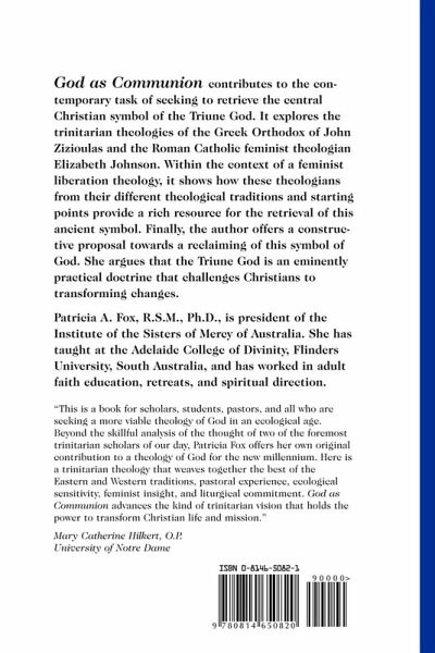 od as Communion explores ancient and new meanings of the symbol of God as Trinity and brings the Christian traditions of West and East into dialogue. Through an exploration of the works of two contemporary theologians, John Zizioulas and Elizabeth Johnson, Patricia Fox retrieves this central Christian symbol and uncovers its transforming power for the Church and world today. God as Communion shows how both Zizioulas and Johnson, from their very different theological traditions and starting points, provide a rich understanding of the symbol of the Triune God. Fox proposes we reclaim that doctrine of the Trinity as an eminently practical doctrine that challenges Christians and the Christian Churches to transforming changes in this new century.