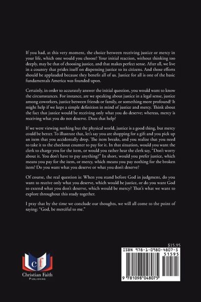 If you had, at this very moment, the choice between receiving justice or mercy in your life, which one would you choose? Your initial reaction, without thinking too deeply, may be that of choosing justice, and that makes perfect sense. After all, we live in a country that prides itself on dispensing justice to its citizens. And those efforts should be applauded because they benefit all of us. Justice for all is one of the basic fundamentals America was founded upon. Certainly, in order to accurately answer the initial question, you would want to know the circumstances. For instance, are we speaking about justice in a legal sense, justice among coworkers, justice between friends or family, or something more profound? It might help if we kept a simple definition in mind of justice and mercy. Think about the fact that justice would be receiving only what you do deserve; whereas, mercy is receiving what you do not deserve. Does that help? If we were viewing nothing but the physical world, justice is a good thing, but mercy could be better. To illustrate that, let's say you are shopping for a gift and you pick up an item that you accidentally drop. The item breaks, and you realize that you need to take it to the checkout counter to pay for it. In that situation, would you want the clerk to charge you for the item, or would you rather hear the clerk say, "Don't worry about it. You don't have to pay anything?" In short, would you prefer justice, which means you pay for the item, or mercy, which means you pay nothing for the broken item? Do you want what you deserve or what you don't deserve? Of course, the real question is: When you stand before God in judgment, do you want to receive only what you deserve, which would be justice, or do you want God to extend what you don't deserve, which would be mercy? That's what we want to explore throughout this study together. I pray that by the time we conclude our thoughts, we will all come to the point of saying: "God, be merciful to me."