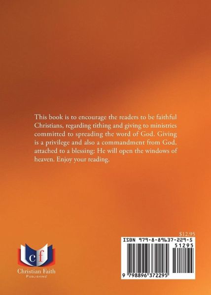 This book is to encourage the readers to be faithful Christians, regarding tithing and giving to ministries committed to spreading the word of God. Giving is a privilege and also a commandment from God, attached to a blessing: He will open the windows of heaven. Enjoy your reading.