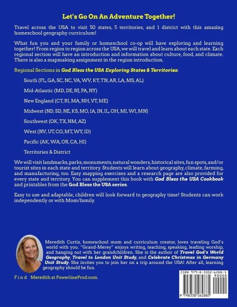 Study US geography the fun way! Our adventures takes us across the USA to visit 50 states, 5 territories, and 1 district in this amazing geography curriculum visiting beautiful parks, historic landmarks, bustling cities, and quaint towns in this conversational textbook! (color pages) Get ready to encounter the unique things that make each state special. This geography adventure introduces students to rivers, oceans, lakes, forests, mountains, caves, and other landforms. We will discover cities, highways, companies, churches, museums, and fun plans to explore. Students will map, research, draw, and travel from state to state. Bonus: we will visit our five inhabited territories and one district. What fun you and your family or homeschool co-op will have exploring and learning together! For extra fun, add God Bless the USA Cookbook by Meredith Curtis to your US Geography course. Travel is my favorite way to learn geography. If you can't visit all 50 states in person, then God Bless the USA States & Territories is the Next Best Thing! We explore each state on a trip visiting the exciting spots. Here's how God Bless the USA Exploring States & Territories works! After a brief look at the entire country, we will study the states region by region. Each State Regional Section opens with an introduction and mapping assignments.Overview List of States (or territories) Map of USA-student colors Resources Climate Culture/Food Blank Outline Map with Directions to Create Own Map (not for territories) Students make a map key and create a map with landforms, the capital of each state, and the name of each state. After the introduction to the region, we learn about each state! 4 pages are devoted to every state and inhabited territory. Individual State Studies: First Two Pages Highlights from each state. We can't see everything in each state; instead we visit a few landmarks special places, and fun spots. The reader and the author (me!) visit beaches, museums, presidential homes, caves, ghost towns, and gardens at various times. Through conversation writing, we also visit beaches, museums, presidential homes, caves, ghost towns, and gardens. We go sightseeing, swimming, hiking, and driving to explore the USA. Geography In the first 2 pages of each section, I give a brief overview of the physical geography and climate in one paragraph. Maps are included. Climate In the beginning of the book, I give a brief climate overview using a climate map (Koppen Climate Zones). Business & Farming Also mentioned are business and farm production - crops & livestock. Individual State Studies: Third Page The third page is a road map with simple instructions. Individual State Studies: Fourth Page Students research and record state capital, bird, flower, lakes, river, statehood, fun fact, and places to visit. Students draw the flag with colored pencils. Are you ready for a grand adventure from sea to shining sea? Learn US geography the fun way with our God Bless the USA series.