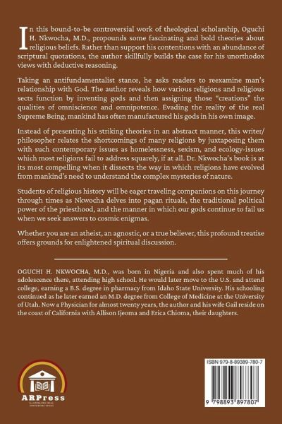 In this bound-to-be controversial work of theological scholarship, Oguchi H. Nkwocha, M.D., propounds some fascinating and bold theories about religious beliefs. Rather than support his contentions with an abundance of scriptural quotations, the author skillfully builds the case for his unorthodox views with deductive reasoning.Taking an antifundamentalist stance, he asks readers to reexamine man's relationship with God. The author reveals how various religions and religious sects function by inventing gods and then assigning those "creations" the qualities of omniscience and omnipotence. Evading the reality of the real Supreme Being, mankind has often manufactured his gods in his own image.Instead of presenting his striking theories in an abstract manner, this writer/philosopher relates the shortcomings of many religions by juxtaposing them with such contemporary issues as homelessness, sexism, and ecology-issues which most religions fail to address squarely, if at all. Dr. Nkwocha's book is at its most compelling when it dissects the way in which religions have evolved from mankind's need to understand the complex mysteries of nature.Students of religious history will be eager traveling companions on this journey through times as Nkwocha delves into pagan rituals, the traditional political power of the priesthood, and the manner in which our gods continue to fail us when we seek answers to cosmic enigmas.Whether you are an atheist, an agnostic, or a true believer, this profound treatise offers grounds for enlightened spiritual discussion.