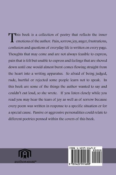 This book is a collection of poetry that reflects the inner emotions of the author. Pain, sorrow, joy, anger, frustrations, confusion and questions of everyday life is written on every page. Thoughts that may come and are not always feasible to express, pain that is felt but unable to express and feelings that are shoved down until one would almost burst comes flowing straight from the heart into a writing apparatus. So afraid of being judged, rude, hurtful or rejected some people learn not to speak. In this book are some of the things the author wanted to say and couldn't out loud, so she wrote. If you listen closely while you read you may hear the tears of joy as well as of sorrow because every poem was written in response to a specific situation or for a special cause. Passive or aggressive personalities could relate to different poetries penned within the covers of this book.