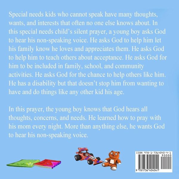 This book is a special needs child's silent prayer book utilizing family prayer to help non-speaking children with Autism and Special Needs to learn how to pray and communicate with God in their own manner.