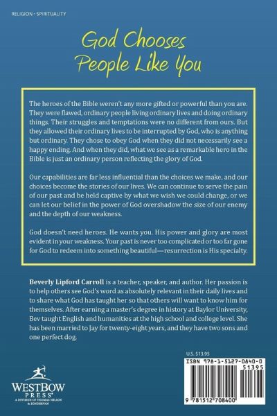 The heroes of the Bible weren't any more gifted or powerful than you are. They were flawed, ordinary people living ordinary lives and doing ordinary things. Their struggles and temptations were no different from ours. But they allowed their ordinary lives to be interrupted by God, who is anything but ordinary. They chose to obey God when they did not necessarily see a happy ending. And when they did, what we see as a remarkable hero in the Bible is just an ordinary person reflecting the glory of God. Our capabilities are far less influential than the choices we make, and our choices become the stories of our lives. We can continue to serve the pain of our past and be held captive by what we wish we could change, or we can let our belief in the power of God overshadow the size of our enemy and the depth of our weakness. God doesn't need heroes. He wants you. His power and glory are most evident in your weakness. Your past is never too complicated or too far gone for God to redeem into something beautiful-resurrection is His specialty.