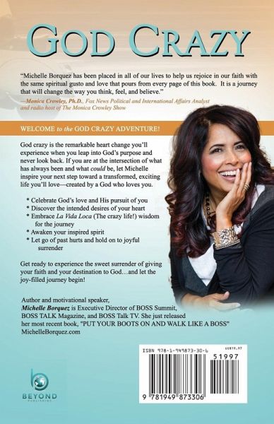 After maintaining the appearance of an ideal marriage and life, Borquez's façade finally shattered. In that brokenness she discovered a renewed, passionate love for Christ and a hunger for deeper faith. Her testimony and perspective-changing insight inspires women to seek God as the sole source for fulfillment as they: give their lives over to God's lead embrace la vida loca ideas for their faith journey discover and pursue the desires of their hearts God crazy is the remarkable heart change that happens when women leap into God's purpose and never look back. Borquez leads women to that point of transformation when faith is not just a belief but is their inspiration to soar as God intended. MichelleBorquez.com