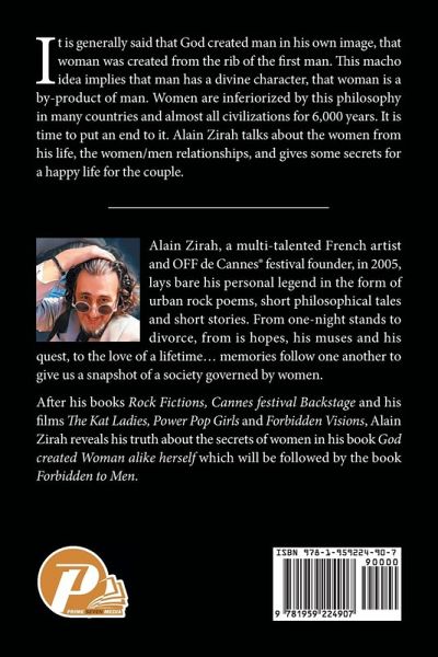 It is generally said that God created man in his own image, that woman was created from the rib of the first man. This macho idea implies that man has a divine character, that woman is a by-product of man. Women are inferiorized by this philosophy in many countries and almost all civilizations for 6,000 years. It is time to put an end to it. Alain Zirah talks about the women from his life, the women/men relationships, and gives some secrets for a happy life for the couple.
