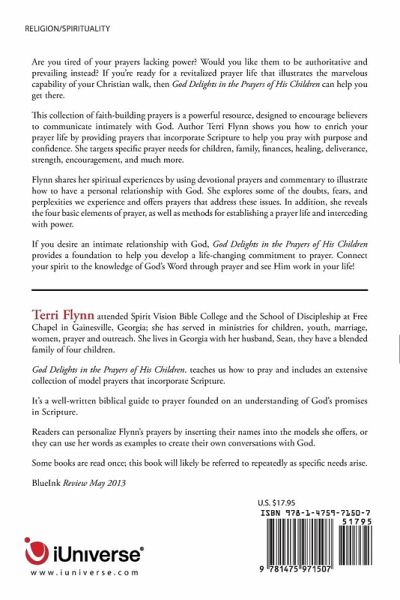 Are you tired of your prayers lacking power? Would you like them to be authoritative and prevailing instead? If you're ready for a revitalized prayer life that illustrates the marvelous capability of your Christian walk, then God Delights in the Prayers of His Children can help you get there. This collection of faith-building prayers is a powerful resource, designed to encourage believers to communicate intimately with God. Author Terri Flynn shows you how to enrich your prayer life by providing prayers that incorporate Scripture to help you pray with purpose and confidence. She targets specific prayer needs for children, family, finances, healing, deliverance, strength, encouragement, and much more. Flynn shares her spiritual experiences by using devotional prayers and commentary to illustrate how to have a personal relationship with God. She explores some of the doubts, fears, and perplexities we experience and offers prayers that address these issues. In addition, she reveals the four basic elements of prayer, as well as methods for establishing a prayer life and interceding with power. If you desire an intimate relationship with God, God Delights in the Prayers of His Children provides a foundation to help you develop a life-changing commitment to prayer. Connect your spirit to the knowledge of God's Word through prayer and see Him work in your life!