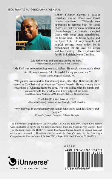 "My father was and continues to be my hero." - Frederick Baker, Fayetteville, North Carolina "My Dad was an outstanding man and father. He taught me so much about life. He was a wonderful role model for my sons and me" -Joseph Garris, Stepson, Raleigh, NC "No greater love could be found in any man, other than the Bob Garrett. We served as Co-Chairs of our churches Trustee Boards. He was always there regardless of what needed to be done. He was skilled with his hands and endowed with the wisdom and knowledge of the Lord." -Carl Dean, Saint Mather AME Church, Raleigh, North Carolina "Bob taught us all how to live." -Henrietta Cassady, Sister-in-Law, Raleigh, North Carolina My dad was an extraordinary gentleman who loved God, his family and people." -Chaunt'e Garrett, Daughter, Atlanta, Georgia. The Lineberger Comprehensive Cancer Center (LCCC) and Rex UNC-Health Care System were invaluable to Bobby and his family during his trials and triumphs with Cancer. Each year the family hosts the Bobby F. Garrett Esophageal Cancer Benefit to support head and neck cancer research. Donoations can be made in Bobby' s name to the Lineberger Comprehensive Cancer Center, P.O. Box 7295, Chapel Hill, North Carolina 27599-7295.
