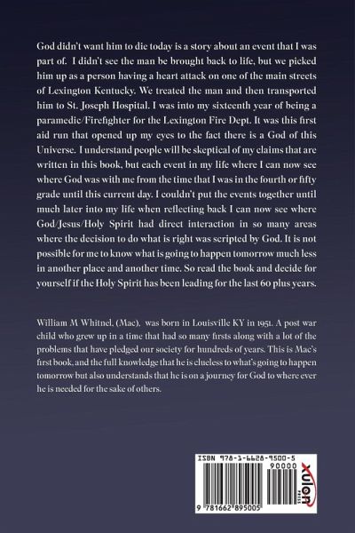 God didn't want him to die today is a story about an event that I was part of. I didn't see the man be brought back to life, but we picked him up as a person having a heart attack on one of the main streets of Lexington Kentucky. We treated the man and then transported him to St. Joseph Hospital. I was into my sixteenth year of being a paramedic/Firefighter for the Lexington Fire Dept. It was this first aid run that opened up my eyes to the fact there is a God of this Universe. I understand people will be skeptical of my claims that are written in this book, but each event in my life where I can now see where God was with me from the time that I was in the fourth or fifty grade until this current day. I couldn't put the events together until much later into my life when reflecting back I can now see where God/Jesus/Holy Spirit had direct interaction in so many areas where the decision to do what is right was scripted by God. It is not possible for me to know what is going to happen tomorrow much less in another place and another time. So read the book and decide for yourself if the Holy Spirit has been leading for the last 60 plus years. William M Whitnel, (Mac), was born in Louisville KY in 1951. A post war child who grew up in a time that had so many firsts along with a lot of the problems that have pledged our society for hundreds of years. This is Mac's first book, and the full knowledge that he is clueless to what's going to happen tomorrow but also understands that he is on a journey for God to where ever he is needed for the sake of others.